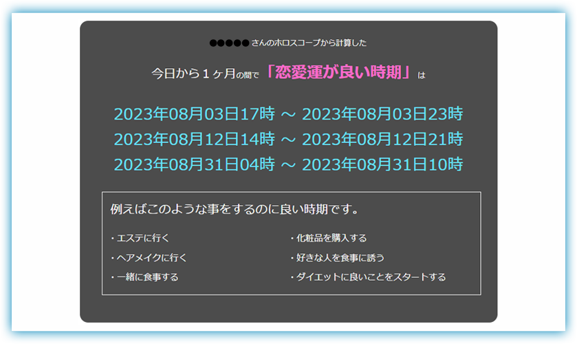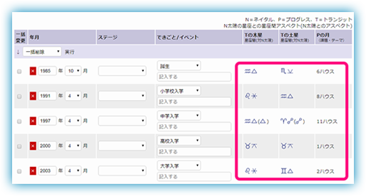 - 指定した期間にできるアスペクトの一覧表で未来予測できる!