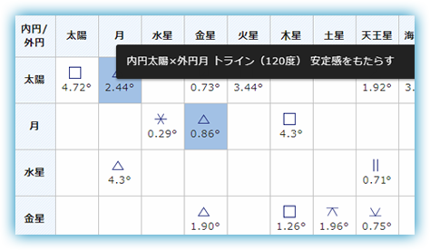 - 二重円で相性診断でき、二人のアスペクトの意味も表示